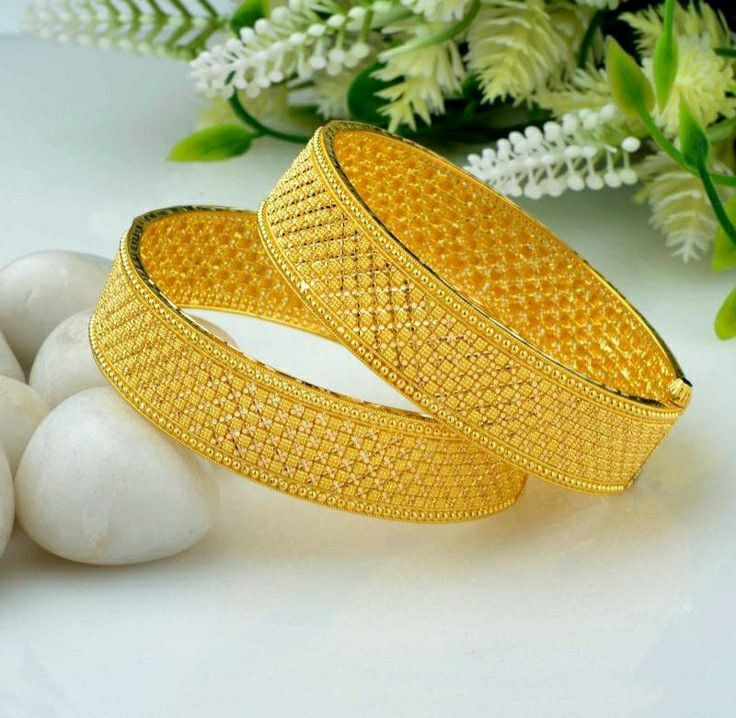 A pair of broad, traditional bangles featuring a signature honeycomb or “jaali” (lattice) cutwork design. They are crafted from a base metal like brass or copper with a high-polish gold finish, making them ideal for weddings, festivals, and ethnic celebrations.